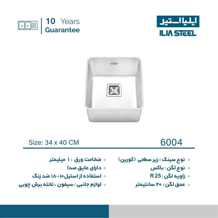 سینک ایلیا استیل 6004 زیرکار ( کورین ) این محصول دارای لگن با زاویه R25 و عمق لگن 20 سانتی متر عرضه میگردد. ابعاد این سینک 34 در 40 سانتی گراد میباشد