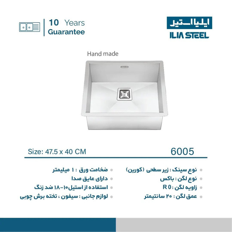 سینک ایلیا استیل 6005 زیرکار دارای ابعاد 47 در 40 سانتی متر و لگن دست ساز با زاویه R0 و ضخامت ورق استفاده شده 1 میلیمتری میباشد.