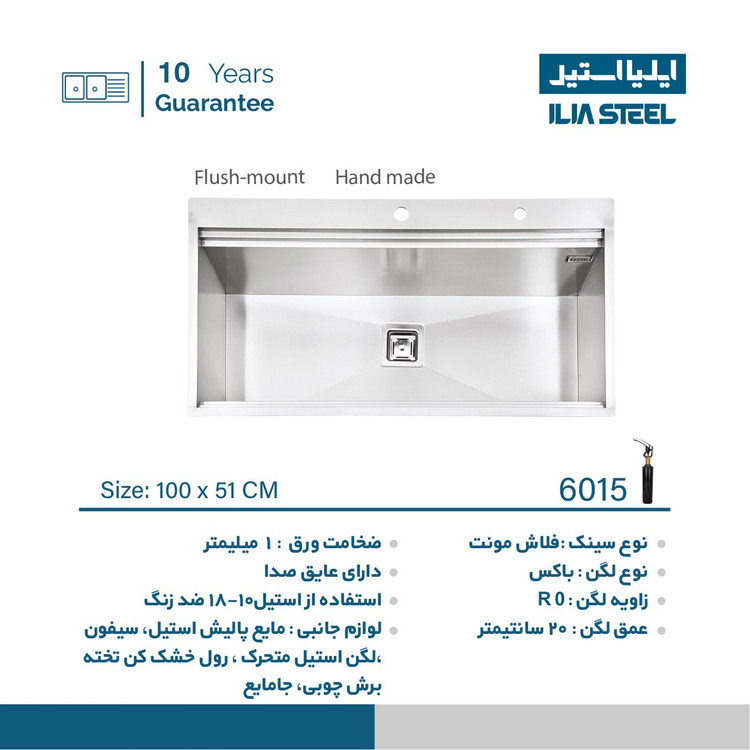 سینک ایلیا استیل 6015 توکار این مدل سینک دارای عمق لگن 20 سانتیمتر به همراه ورق استیل 1 میلیمتری و لوازم جانبی پیش بند, تخته ساطور , توری , رول خشک کن, سیفون, صافی کشویی تولید میگردد