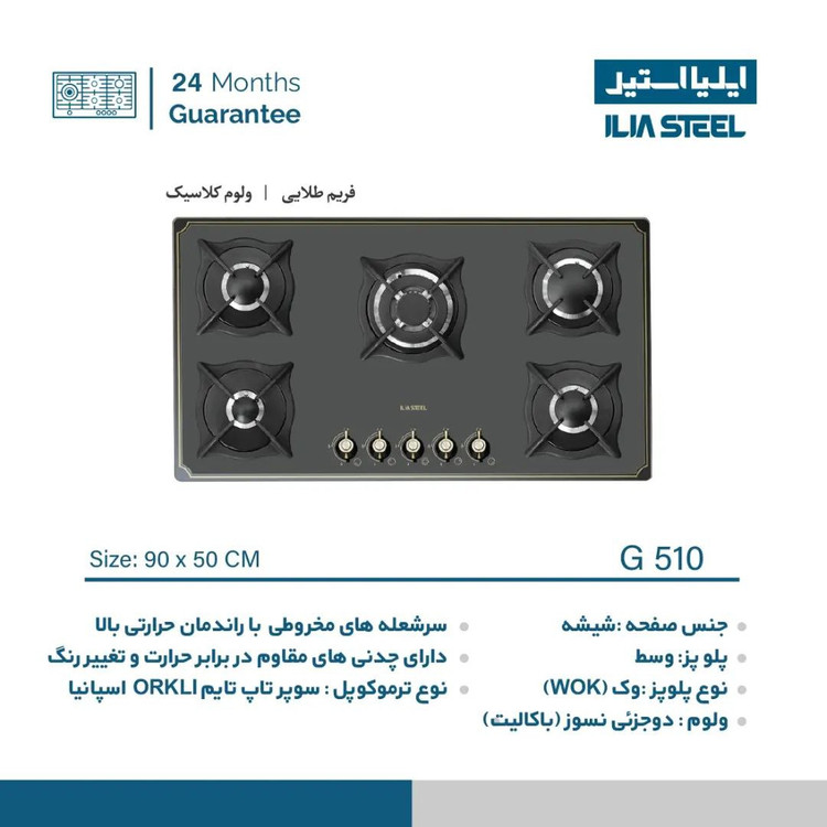 گاز ایلیا استیل مدل G510 این مدل اجاق گاز صفحه ای دارای طراحی کلاسیک با ولوم های با کیفیت طلایی میباشد. ابعاد این محصول 90 در 50 سانت است