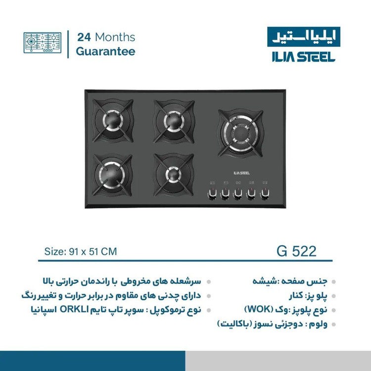 گاز ایلیا استیل مدل G 522 با نمای شیشه سکوریت مشکی . این اجاق گاز رومیزی دارای سرشعله قارچی ( مخروطی ) میباشد. تفاوت در شکل سر شعله به معنی بالاتر یا پایین تر بودن قدرت حرارت دهی نیست