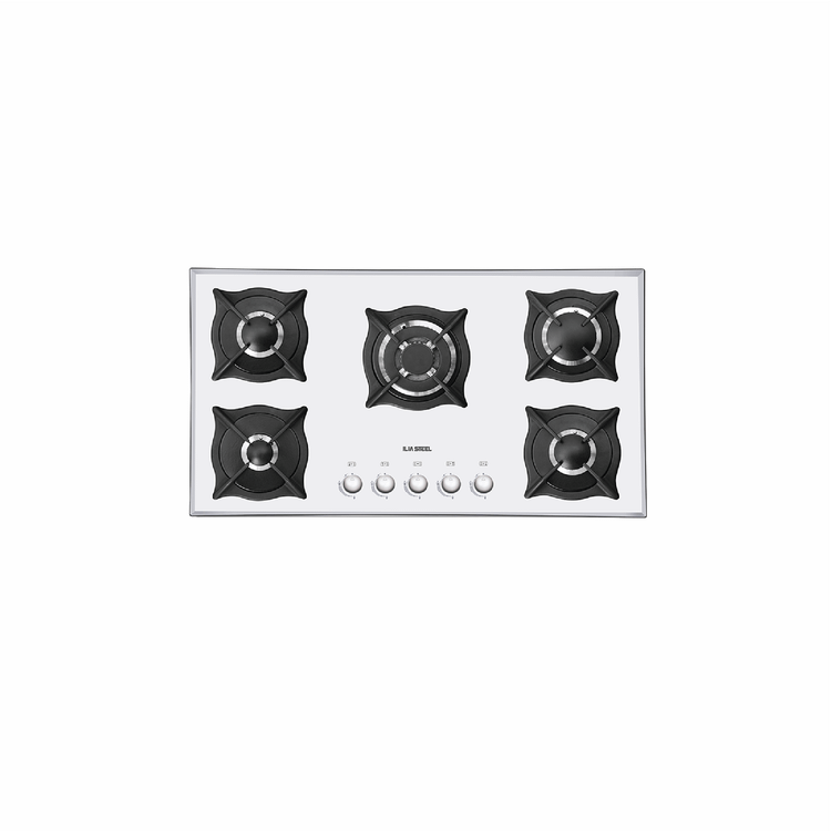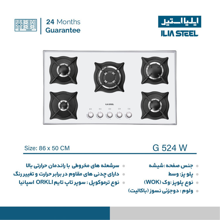 گاز ایلیا استیل مدل G 524W این مدل اجاق گاز رومیزی دارای نمای شیشه سکورت سفید( مقاوم در بربابر حرارت و ضربه ) با سایز 86 * 50 سانت به همراه سرشعله های محبوب قارچی