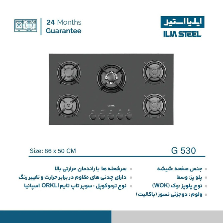 گاز ایلیا استیل مدل G530 این محصول دارای قطعات اصلی ساخت کشور ایران با نمای شیشه سکوریت مشکی مقاوم در برابر حرارت و ضربه به همراه جرقه زن اتوماتیک و ترموکوبل میباشد