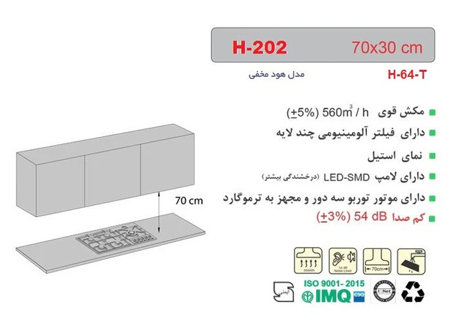 هود مخفی اخوان H202 این مدل هود کارخانه اخوان دارای نمای استیل 304 ساده با ظاهری دقیقا شبیه به هود 204 با تفاوت برد بهتر و مصرف برق کمتر طول این هود مخفی 70 سانتی متر و دارای صفحه کلید مکانیکی است. این مدل بهطور کامل در کابینت نصب میشود و تنها بخش کوچکی از آن (معمولاً پنل کنترل یا فیلتر) قابل مشاهده است. طول 70 سانتیمتر باعث میشود این هود بهخوبی با اجاقگازهای کوچک و متوسط هماهنگ شود و مناسب برای فضاهای محدود است که ضمن عملکرد قوی، زیبایی خاصی به آشپزخانه میبخشد. با وجود اندازهی جمع و جور، توانایی جذب بخار و چربی را به خوبی دارد.