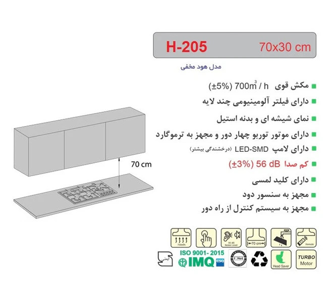 هود اخوان مخفی H205 (H64TCS) این محصول با نمای شیشه و استیل ویژگی متمایز کننده این مدل نسبت به مدل های مشابه اضافه شدن قطعه سنسور تشخیص دود و حرارت به سایر تجهیزات آن می باشد که در مواقع لزوم دستگاه را به صورت اتوماتیک روشن کرده و موتور با بالاترین دور خود اقدام به مکش می نماید. ا دیگر ویژگی این محصول میتوان به فیلتر آلومینیومی چند لایه در این محصول اشاره نمود که به خوبی میتواند مواد معلق در هوا را فیلتر نماید. استفاده از استیل با کیفیت بالا باعث میشود که در برابر چربی، رطوبت و حرارت مقاوم باشد و به راحتی تمیز شود.