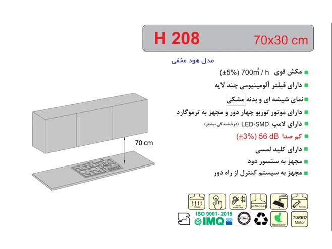 هود اخوان مخفی H203 این مدل بدون ایجاد برآمدگی یا ناهماهنگی در ظاهر آشپزخانه با سایز 30*70 و قدرت مکش 700 متر مکعب با میزان صدای 56 دسیبل می باشد به همراه فیلتر آلومینیومی چند لایه قابل شستشو (حتی در ماشین ظرفشویی) می باشد. این فیلترها از چند لایه شبکهای از آلومینیوم ساخته شدهاند که به خوبی چربیها و ذرات معلق در هوا را جذب میکنند. هر لایه از فیلتر به گونهای طراحی شده است که میزان جذب را افزایش میدهد و باعث کارایی بالاتر میشود. تمام تولیدات اخوان دارای 20 ضمانت در سراسر کشور میباشد که با خیالی آسوده میتواند استفاده نمایید