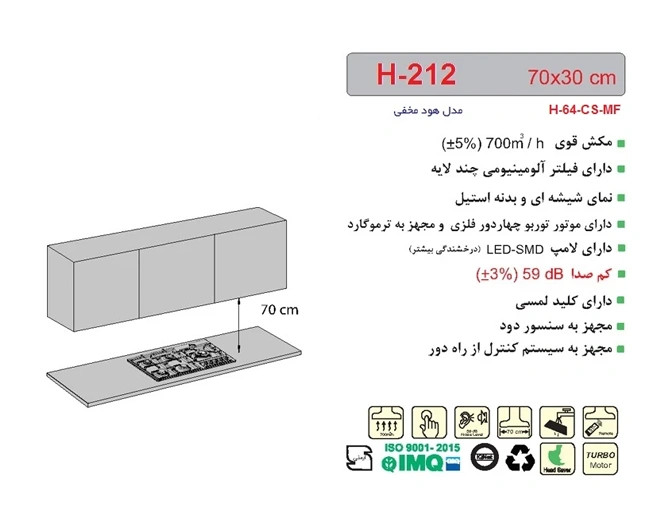 هود اخوان H212 مخفی این محصول دارای موتور فلزی 3 دور به همراه سیستم روشنایی هود اخوان از لامپ های SMD که دارای نوردهی بیشتر و مصرف کمتر و دارای سنسور بو و دود می باشد که به محض فعال شدن این سنسور هود به صورت اتوماتیک روشن می کند. بیشتر اجزای این محصول، بهویژه موتور و لولههای مکش، درون کابینت مخفی میشود. موتور فلزی این محصول از جنس آلیاژ مقاوم است که در برابر حرارت و رطوبت دوام بالایی دارد. این هودها طراحی ساده و ظریفی دارند و برای افرادی که به دکوراسیون آشپزخانه مرتب و بدون المانهای اضافه علاقه دارند، بسیار مناسب هستند