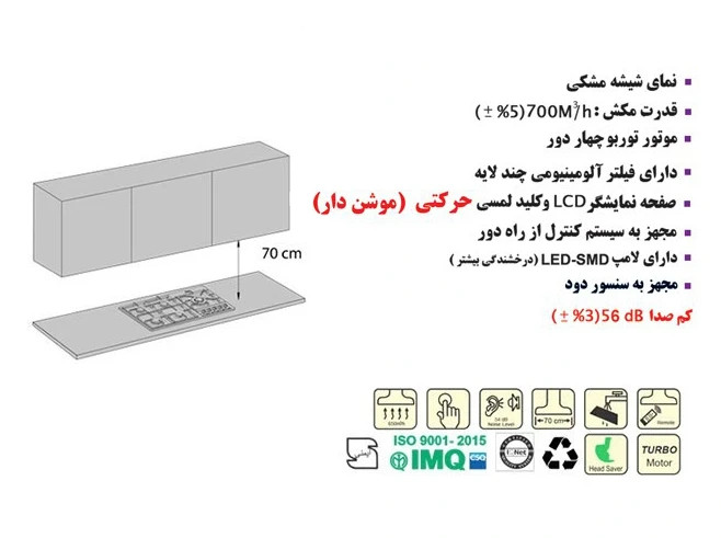 هود اخوان h221 مخفی این محصول که با نمای شیشه سکوریت مشکی و درب شیشه ای جکی روی فیلتر طراحی شده است، این هود آشپزخانه مخفی از یک موتور توربو 4 دور بهره می برد. مهمترین ویژگی این هود روشن شدن با حرکت دست است ( بدون نیاز به لمس مستقیم، هود آشپزخانه را تنها با حرکت دست کنترل کنند. این ویژگی به خصوص در هنگام آشپزی که دستها ممکن است چرب یا آلوده باشند، بسیار مفید است و به بهداشت و راحتی بیشتر در آشپزخانه کمک میکند. ) که با دیگر تولیدات متمایز شده است.