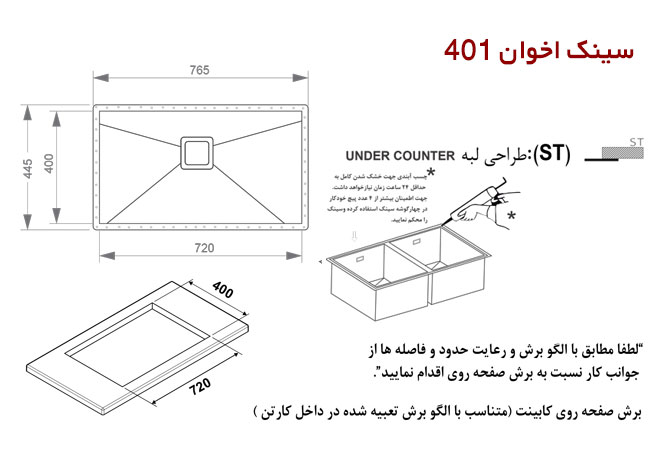 سینک اخوان زیرکار 401 زیر صفحه ای ، نصب این سینک زیر کورین میباشد عرض این محصول 72 سانتی متر میباشد و با لگن دست ساز میباشد. از ویژگی های این محصول میتوان به عمق لگن مناسب اشاره نمود