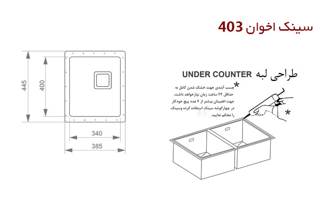 سینک اخوان زیرکار 402 با نصب زیر صفحه ای ( کورین ) دارای ورق یک میلیمتری ابعاد این لگن 60 * 40 سانت میباشد. این محصول قابل نصب به صورت زیر صفحه میباشد. نمای ظاهری آن به صورت استیل با ضخامت بالا می باشد. این سینک به صورت تک لگن و بدون سینی عرضه شده است. این سینک از نوع عمیق به حساب می آید
