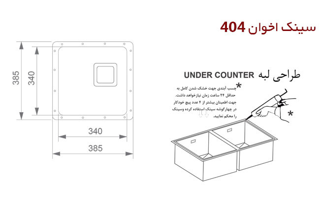 سینک اخوان زیرکار 404 با عمق 20 سانت و ورق 1 میلیمتری با کیفیت و ابعاد 34 سانتی متر . این محصول دارای طراحی لگن محبوب R 25 میباشد تمیر نمودن گوشه های لگن