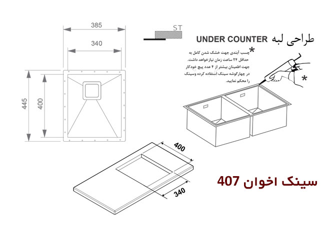 سینک اخوان زیرکار 407 در ابعاد 40 در 34 سانتی متر نصب این محصول به صورت زیر کورین میباشد و دارای لگن به صورت دست ساز است. این محصول قابل نصب در زیر کار میباشد