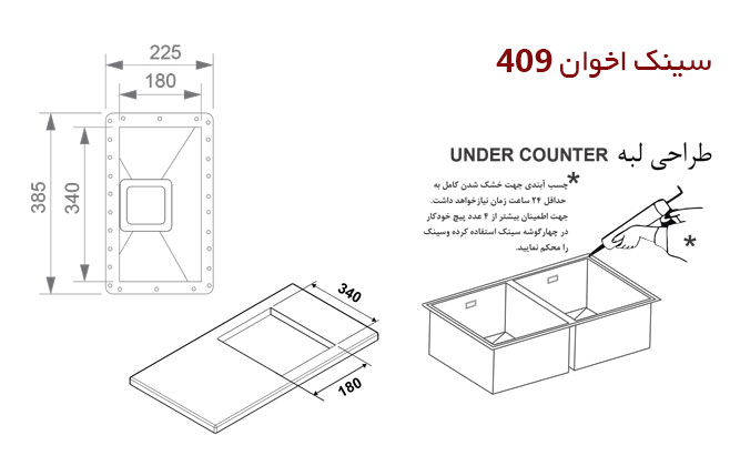 سینک اخوان زیرکار 409 نصب این محصول به صورت زیرکار ( کورین ) و با ابعاد 34 * 18 سانتی متری و ضخامت ور ق 1 میلیمتری تولید میگردد که به همراه سیفون فانتزی تخلیه مربع