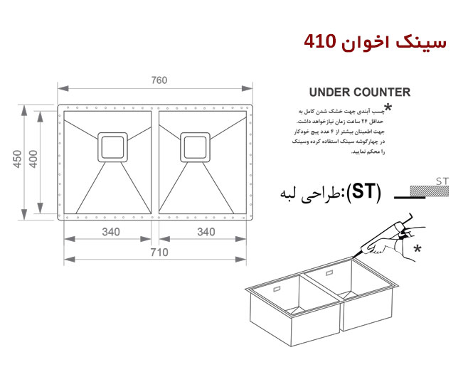 سینک زیر کورین 410 اخوان این محصول دارای ابعاد 71 * 40 سانتی متر میباشد قابل نصب بر روی کابینت های با صفحه کورین و سنگ میباشد. این سینک به صورت دست ساز با ضخامت ورق 1 میلیمتری میباشد. در سری های جدید این محصول از زیر آب طرح مربع استفاده گردیده شده است