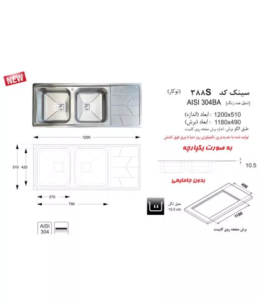 سینک 388S اخوان با ورق 0/8 میلیمتر و ابعاد 51*120 سانت دارای دو لگن باکسی به عمق 15 سانت بوده که زیر آب مربعی به زیبایی هز چه بیشتر این سینک توکار اخوان کمک کرده است.