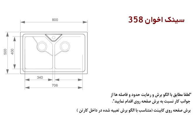 سینک اخوان توکار مدل 358 این محصول دارای دو لگن عمیق 20 سانتی متر ساخته شده با ورق 1 میلیمتری. ابعاد این سینک 80 * 50 سانت و بدون سینی میباشد
