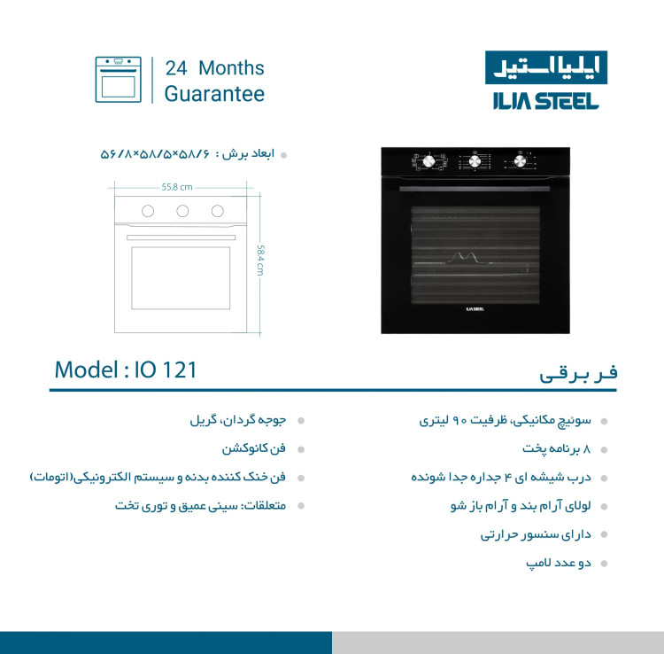 فر IO 121 با طراحی مدرن و متد روز عرضه شده . درب شیشهای 4 جداره جداشونده با لولای آرامبند و آرامبازشو، استفاده راحت و ایمن را برای مصرف کنندگان فراهم کرده است.