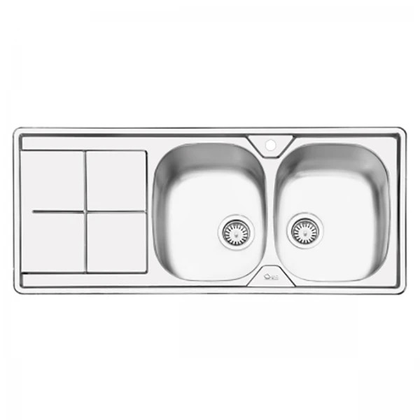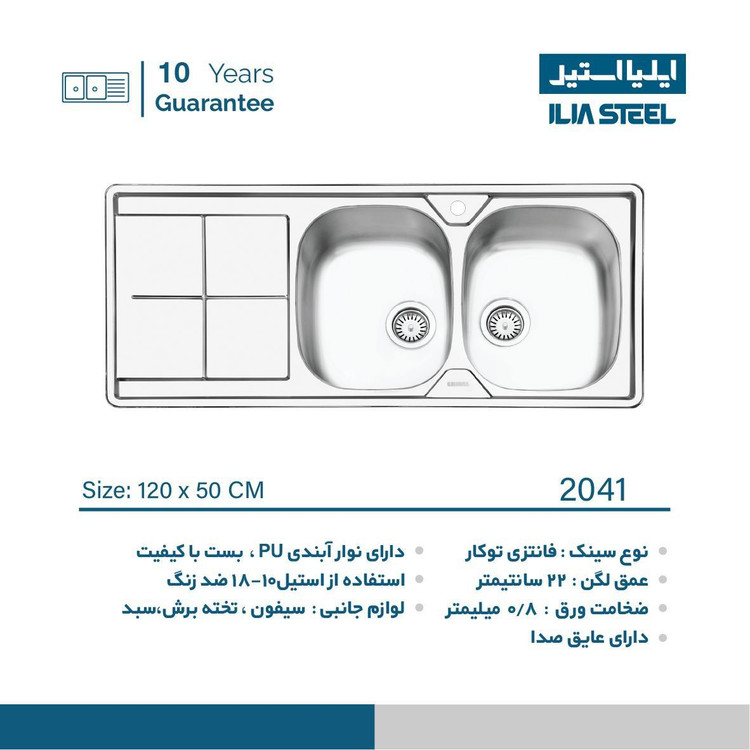 سینک ایلیا استیل 2041 توکار این محصول دارای دو لگن بزرگ هم سایز با ورق استیل ساخت کره و ضخامت 0/8 میلیمتری. از ویژگی های بارز سینک های ایلیا استیل میتوان به لبه عمیق برای جلوگیری از بیرون زدن آب اشاره نمود