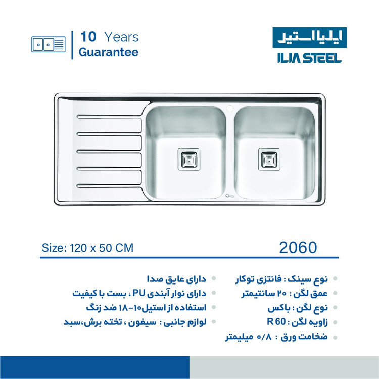 سینک ایلیا استیل 2060 توکار یکی از جدیدترین سینک های کارخانه ایلیا استیل این محصول است که دارای عمق لگن 22 سانت و ظرفیت مجموع لگن های 60 لیتر تولید میگردد. از ویژگی های ابن مدل سینک میتوان به لبه های بلند اشاره نمود که بیرون زدن آب از سینک را تا حد بالایی جلوگیری مینماید