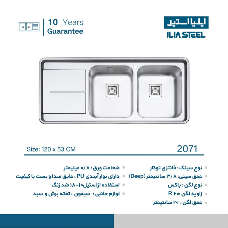 سینک ایلیا استیل 2071 توکار این مدل سینک ظرفشویی استیل دارای لگن با طراحی R60 و ضخامت ورق 0/8 میلیمتری تولید میگردد. از ویژگی های این محصول میتوان به عمق سینی 3.8 سانتیمتر اشاره نمود که بیرون امدن آب از سینک رو به حداقل میرساند